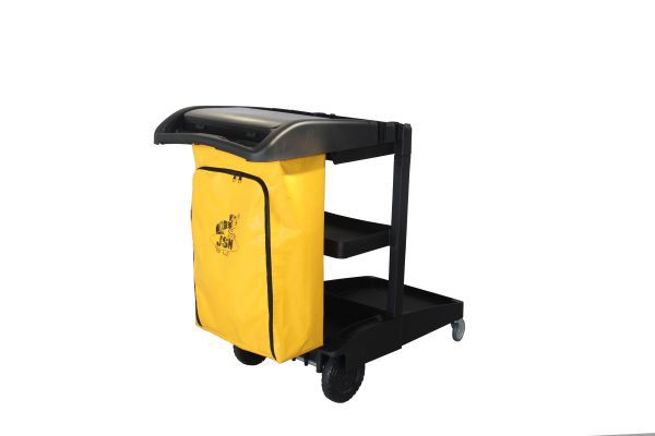Proporciona maior eficiência na elaboração de tarefas, pois tem a função de transportar diversos acessórios de uma só vez. Possui aberturas para encaixe dos acessórios (mops, pá e placa), bem como uma plataforma para apoio do balde espremedor e estojo no compartimento de encaixe do saco. Possui cantos arredondados e excelente acabamento.